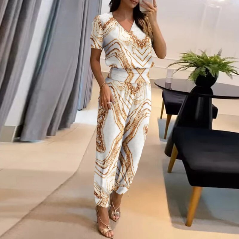 Lasciati avvolgere dalla sinuosa semplicità di questo ensemble senza tempo, composto da una delicata maglia con scollo a V abbinata a pantaloni comodi. La maglia, con il suo elegante scollo a V che slancia la figura e aggiunge un tocco di femminilità, incarna l'eleganza discreta e sofisticata. I pantaloni, con la loro vestibilità comoda e rilassata, offrono il massimo del comfort senza rinunciare allo stile, garantendo un look impeccabile e senza sforzo in qualsiasi occasione.